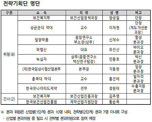 기획단 위원은 총 8명으로, 신재수 일양약품 중앙영구소장(상무)이 합성분과장에, 유진산 파멥신 대표가 바이오분과장에, 안동호 녹십자 종합연구소 백신연구팀장(상무)이 백신분과장에, 지동현 한국임상시험산업본부장이 임상분과장에, 홍진태 충북약대 교수가 일자리분과장에, 정원태 한국유나이티드제약 전무가 수출지원분과장에 각각 임명됐다. 이와 함께 기획단에는 산·학·연·관에서 70~80여명이 참여할 예정이다.
