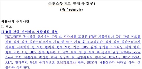 식약처 관계자는 "다클라타스비르를 포함해 현재 국내에서 처방되고 있는 DAA 제제들에 동일하게 해당하는 사안이지만 나머지 약제들의 경우 허가사항에 기반영된 상태"라며, "관련 내용이 포함되지 않았던 길리어드의 제품 2종에 대해 이번에 추가로 허가사항 변경을 검토하고 있다"고 말했다.