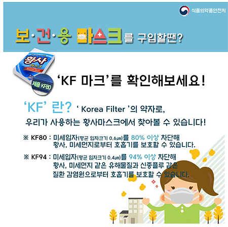 식약처에 따르면 허가된 보건용 마스크 포장에는 입자차단 성능을 나타내는 KF80, KF94, KF99가 표시되어 있는데, KF(Korea Filter)문자 뒤에 붙은 숫자가 클수록 미세입자 차단 효과가 더 크지만, 숨쉬기가 어렵거나 불편할 수 있어 황사‧미세먼지 발생 수준, 사람별 호흡량 등을 고려하여 적당한 제품을 선택하는 것이 바람직하다.