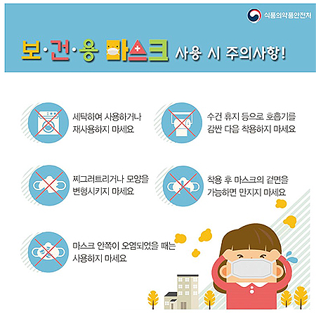 또 수건이나 휴지 등을 덧댄 후 마스크를 사용하면 밀착력이 감소해 미세입자 차단 효과가 떨어질 수 있으므로 주의해야 하고, 착용 후에는 마스크 겉면을 가능하면 만지지 말아야 한다.
