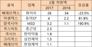 쎄레브렉스는 지난해 1분기 평균 34억 원 이상의 월 처방액을 기록했지만 같은 해 6월 30억 원대로 주저앉았고 올 초에는 25억 원까지 밀렸다.