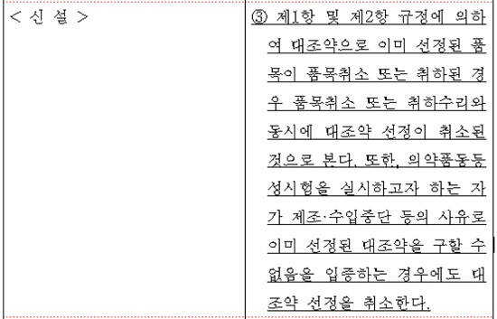 또 '대조약 선정을 취소하는 경우 차순위 품목을 대조약으로 정한다'와 '대조약 선정 의약품이 품목취소 또는 취하된 경우 대조약 선정이 취소된 것으로 본다'는 조항도 신설된다.