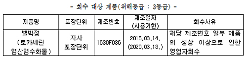 자진회수 품목은 벨빅정 ▲제조번호 1630F036 ▲제조일자 2016.03.14▲사용기한 2020.03.13일이다.