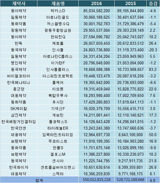 일단 시장에서 입지를 구축한 OTC 제품들은 웬만해선 판매실적이 떨어지지는 않는 경향이 2016년에도 반영됐다.