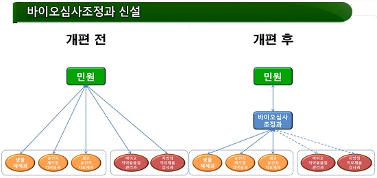 바이오심조과가 생기면 바이오개발사들은 지금까지 생물제제과, 유전자재조합과, 세포치료제과, 바이오의약품관리총괄과 등에 제각기 나눠 보냈던 민원들을 심조과를 통해 제기할 수 있게 된다. 바이오 관련 통합 총괄민원센터가 생기는 셈이다.