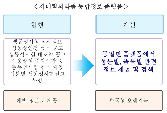 현재 제네릭의 경우 생동성시험 심사정보, 생동성인정 품목 공고, 대조약 공고, 사용상 주의사항 중 동등성시험 정보 제공, 성분별 생동시험 권고사항 등 관련 정보가 산재돼 따로따로 제공되고 있다.