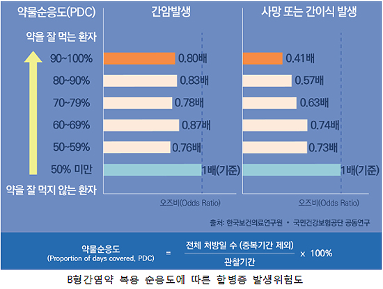 2005년부터 2014년까지 10년 간 만성 B형 간염약을 복용한 환자를 대상으로 약물 복용을 철저히 한 경우와 그렇지 않은 경우로 나눠 사망, 간이식, 간암 등 중증합병증 발생률을 비교분석한 결과, 매일 복용해야 하는 약을 90% 이상으로 철저히 복용한 환자들이 50% 미만으로 복용한 경우에 비해서 사망이나 간이식 위험은 59% 줄고, 간암 위험도는 20% 줄었다.