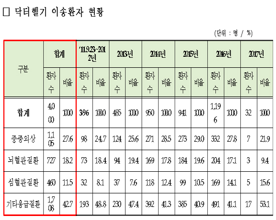 2011년 9월 국내 최초로 운항을 개시한 닥터헬기는 그 해 76명의 중증응급환자를 이송했으며, 2012년 320명, 2013년 485명, 2014년 950명, 2015년 941명, 2016년 1196명을 이송하는 등 점차 운영횟수가 증가하고 있다. 지난 13일에는 이송 환자수가 4000명을 돌파했다.