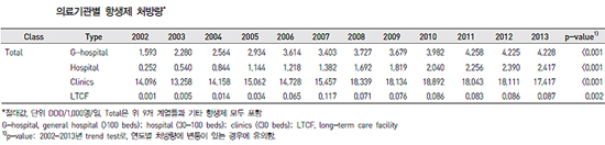 연구결과, 지난 12년 간 국내 총 항생제 처방량은 2002년 1000명당 15.9DDD/일에서 2013년 같은 기준 24.2DDD로 꾸준히 증가했다. 2013년을 기준으로 이 중 페니실린 계열이 7.8DDD/일로 가장 많이 처방됐고 세펨 계열이 7.2DDD/일로 뒤를 이었다.