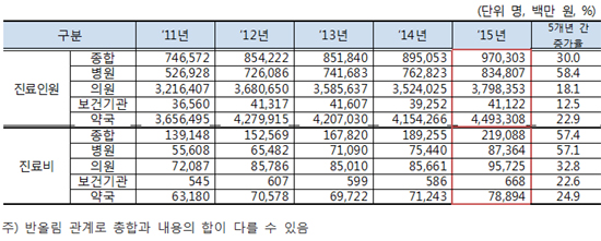 진료인원은 2015년 525만명으로 2011년 424만명에 비해 4년만에 23.6%(101만명) 증가했다.