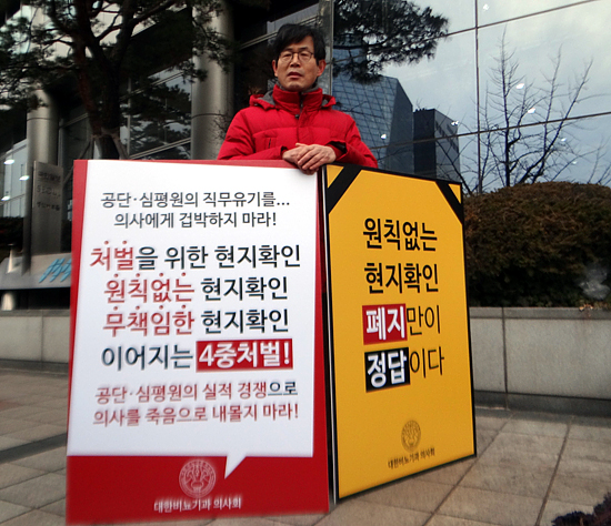 어홍선 대한비뇨기과의사회장은 5일 공단 서울본부(여의도 CCMM빌딩) 앞에서 현지확인 및 현지조사 제도 전면 개선을 위한 1인 시위를 가졌다. 이번 시위는 릴레이 방식으로 공단이 현지확인을 전면 폐지 할 때까지 이어진다.