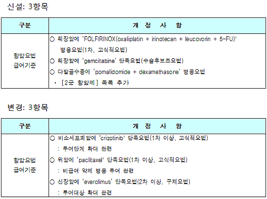 또 췌장암에 폴피리녹스(FOLFIRINOX) 즉, 옥살리플라틴(oxaliplatin과 이리노텍(irinotecan), 레우코보린(leucovorin), 5-FU) 병용요법(1차)과 젬시타빈 단독요법(수술후보조요법), 다발골수종에 신규 등재되는 포말리도마이드(pomalidomide, 포말리스트캡슐)와 덱사메타손(dexamethasone) 병용요법 급여기준이 신설됐다.