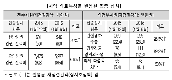 지원설립 효과는 집중심사에서 특히 두드러지게 나타났다. 집중심사는 지역 의료특성을 반영해 실시된다. 전주지원의 경우 한방병원 입원진료비와 요양병원 입원진료비를 집중심사 항목으로 정했다. 이를 통한 재정절감액은 한방병원 5억4600만원, 요양병원 59억7700만원 규모였다. 올해 3~10월 8개월치 실적이지만 2015년 1년치와 비교해도 절감액은 각각 20%와 6.6% 늘었다.