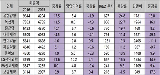 상위기업들은 또 마케팅비용을 포함한 판관비도 늘렸다. 유한양행 16%, 녹십자 16%, LG생명과학 15% 등 지난해와 비교해 판매관리비가 늘어난 상위사들이 눈에띈다.