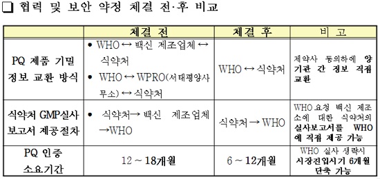 협약 주요내용은 ▲식약처 GMP실사보고서로 WHO실사면제 ▲PQ 인증 백신에 대한 안전관리 정보교환 ▲상호 교환 정보에 대한 기밀 유지 등이다.