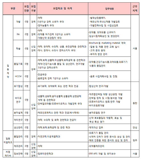 모집 분야는 개발, RA(인허가), 학술, 품질기획, HC CM(헬스케어 카테고리 매니저), 연구부문, 생산부문 등이다. 분야별 중복 지원은 불가하다.