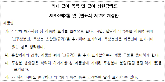 혼합제제의 경우 제품명 뒤에 '_(규격)'을 추가해 제품 구분을 쉽게 할 수 있도록 했으며, 의약품 특성을 고려해 달리 표기해야 할 경우는 사전열람 후 의견을 제출하거나 심평원 약제관리부(02-2182-8507)에 문의하면 된다.