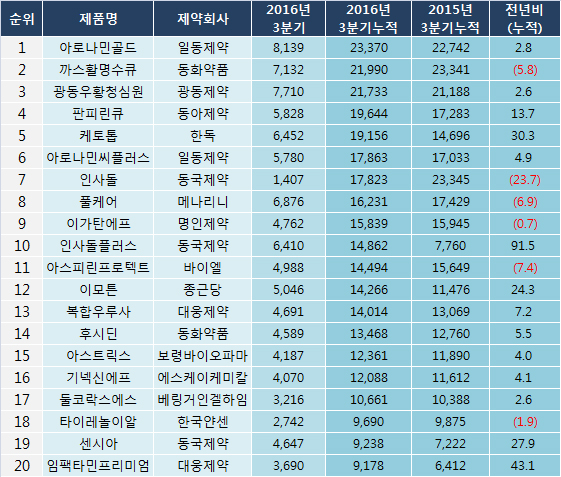 21일 의약품 시장조사기관 IMS헬스데이터를 토대로 2016년 3분기 누적 상위 20개 일반의약품의 판매액을 조사한 결과, 아로나민골드가 전년동기대비 2.8% 오른 234억원으로 1위에 올랐다.