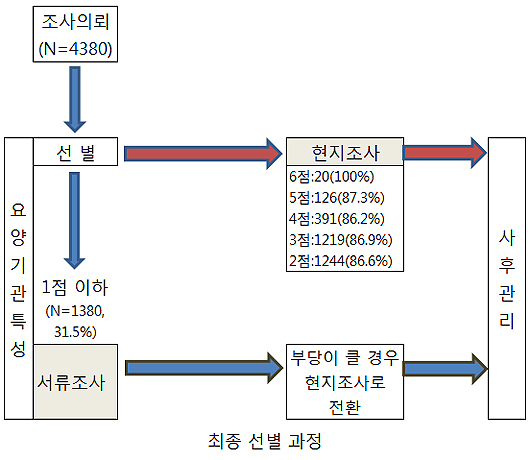 연구진이 제안한 개선방안은 현지조사 대상에 오른 요양기관들에 확률값, 즉 등급을 부여해 높은 점수를 받은 기관들을 우선순위로 현지조사를 진행하는 것이다. 점수가 비교적 낮은 기관들은 서류조사를 통해 진행하는 일종의 '투트랙' 방식이다.