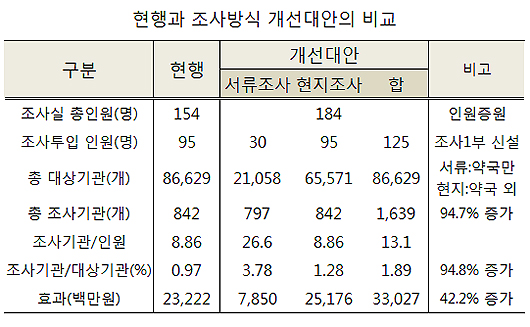 연구진은 "조사 방식을 개선해 향후 현지조사와 함께 서류조사를 위한 인력증가가 필요할 것으로 예상된다"며 인력 재배치에 따라 서류조사부 1부 신설이 필요하다고 제안했다.