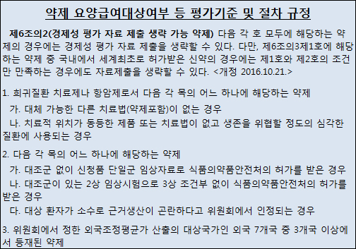 '경평면제' 적용을 받으려면 ▲대체가능한 약제나 치료법이 없거나 ▲3상 조건부 없이 2상으로 허가받은 경우 ▲환자 수가 너무 적어서 근거생산이 곤란한 경우 ▲외국 조정평균가 산출 대상국가인 A7 국가 중 3개국 이상 등제된 경우 등의 요건을 충족해야 한다.