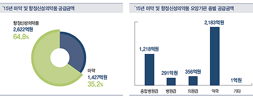 금액 기준으로는 마약운 1427억원, 향정약은 2622억원이 공급됐다. 또 경구약 2787억원, 주사제 926억원, 외용약 등 309억원 규모였다.
