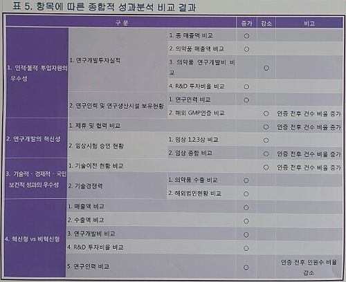 그 결과 인적·물적 투입자원의 우수성과 기술·경제적·국민보건적 성과의 우수성의 혁신형 제약기업, 비혁신형 제약기업 간 비교에서 인증 전보다 인증 후 성장률이 높게 나타난 것으로 확인됐다.