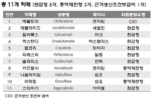 RSA는 현재 기준 총 11개(성분 기준) 약제가 계약이 성립돼 보험급여를 적용받고 있다. 유형별로는 환급형 8개, 총액제한형 2개, 근거생산 조건부급여 1개로 구분된다.