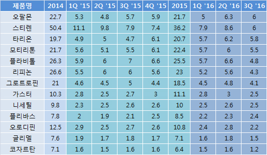 지난 3분기 도입신약인 오팔몬(요부척추관협착증치료제)도 60억원의 매출액을 기록, 스티렌과 동일선상에 놓이게 됐다. 오팔목은 전년동기대비 5.3% 올랐다.