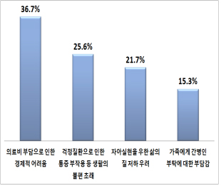 미래에 질환이 발병할 것을 걱정하는 이유로는 의료비 부담(36.7%), 생활불편(25.6%), 삶의 질 저하(21.7%), 간병 부탁에 대한 부담감(15.3%) 등으로 나타났다. 건강보험 또는 의료급여 외에 민간보험, 개인저축 등을 추가로 준비한다는 답변은 81.5%나 됐다.