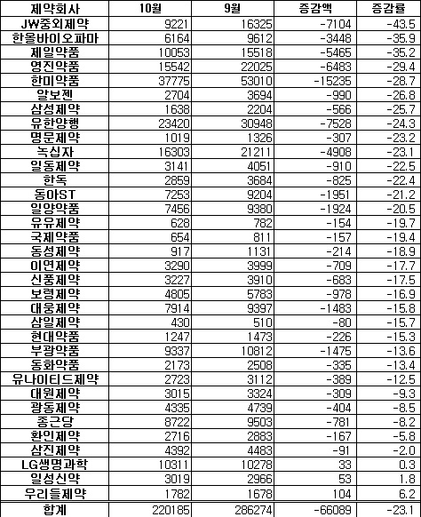 데일리팜이 1일 기준으로 34개 코스피제약사의 10월 시가총액을 분석한 결과 단 3곳을 제외한 모든 제약사들이 하락했으며 총합은 전월대비 무려 6조원 감소했다.