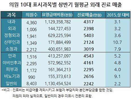 건강보험심사평가원이 최근 발표한 '2016년도 상반기 진료비통계지표'와 국가 통계자료를 바탕으로 데일리팜이 상반기 의원급 10대 표시과목별 외래 환자 급여 매출 실적을 집계한 결과 환자 수와 급여 매출 추이가 반대로 나타나는 경향이 포착됐다.