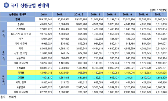 2016년 1월부터 성장세를 보면 의약품과 화장품 모두 상반기에 비해 여름철인 7월 다소 감소한 추세를 보였다. 이는 지난 여름 이례적인 폭염에 상품군 별 소비가 전반적으로 주춤했던 점이 영향을 끼친 것으로 보인다.