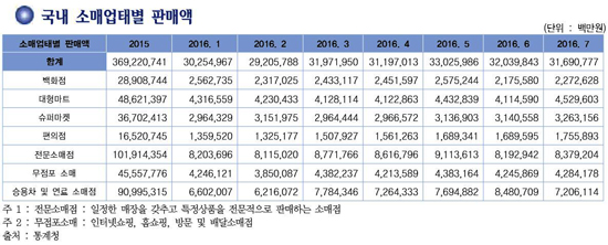 한편 주요 소매업태 중에서는 편의점과 대형마트의 성장세가 눈에 띄었다. 대형마트는 5월(-0.1%) 이후 6월(20.7%)과 7월(19.6%) 높은 성장률을 보였고, 편의점은 2016년 이후 15% 이상의 높은 성장률을 보이고 있다.