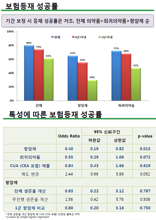 이 중 항암제는 55%, 희귀약은 68% 수준이었다. 그러나 2년 이내 등재에 성공한 항암제는 30%, 희귀약은 47%에 불과했다. 현재 시점에서 전체 약제 80%, 항암제 65%, 희귀약 72% 성공률과 크게 차이나는 대목이다.