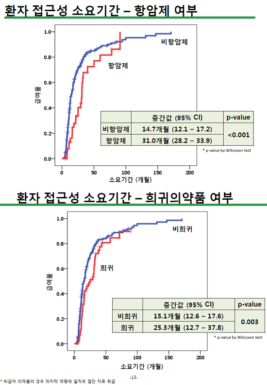환자 접근성 측면에서 식약처 허가일을 기준으로 전체 등재 신약들의 소요기간은 16.3개월 소요되는 것으로 나타났다. 계열별로 분류해보면 항암제 부문의 경우 비항암제는 14.7개월인데 비해 항암제는 31개월이나 소요돼 소요 차가 매우 컸다. 희귀약제 부문은 희귀약 25.3개월, 비희귀약 15.1개월로 소요차는 크지 않았다.