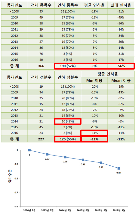 결과적으로 올해 8월을 기준으로 현 약가수준은 5년 전인 2011년 8월 수준의 87%에 불과하다고 볼 수 있다.