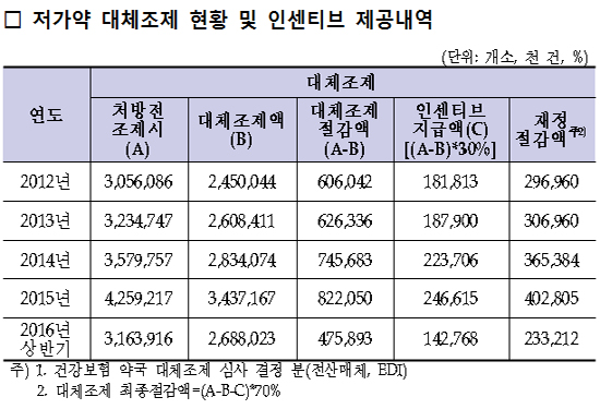 또 같은 기간 대체조제약국들은 대체조제 장려금으로 1억4276만8000원을 지급받았다. 재정절감액은 2억3321만2000원에 그쳤다.