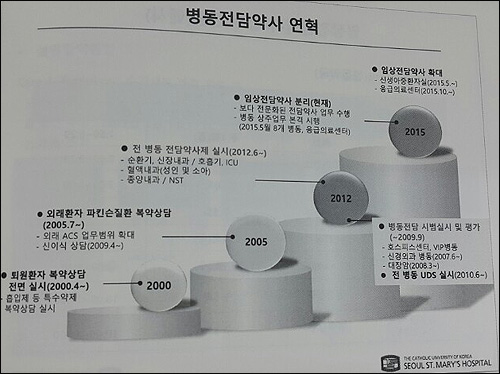 서울성모병원은 시범사업을 거쳐 2012년 6월부터 현재까지 순환기와 신장내과, 혈액내과, 종양내과 등 전 병동 전담약사 제도를 실시하고 있으며, 지난해부터는 보다 전문화된 전담약사의 업무 수행을 위해 임상전담약사를 분리해 병동에 상주하도록 하고 있다.