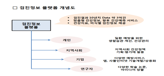 이를 활용해 검진결과와 건강정보를 스마트폰 등으로 서비스한다. 개인의 자기 건강관리를 돕기위해서다. 또 지자체와 기업, 연구자 등이 다양한 건강관리사업에 활용할 수 있도록 수검자의 신상정보가 확인되지 않는 비식별 검진정보를 제공한다.