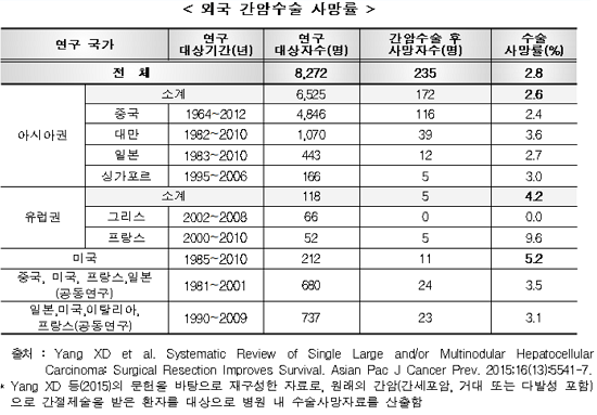 한국 간암 수술사망률이 0.93%인데 비해 아시아 2.6%, 미국 5.2%, 유럽 4.2%로 나타났다.