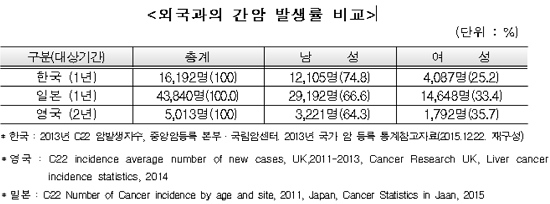 아울러 우리나라의 간암 발생률은 인구 10만명당 32.0명으로 영국(8.4명)에 비하면 3.8배 높았다. 간암 발생률을 성별로 살펴보면, 남성 발생률은 일본 66.6%, 영국 64.3%에 비해 우리나라는 74.8%로 집계됐다.