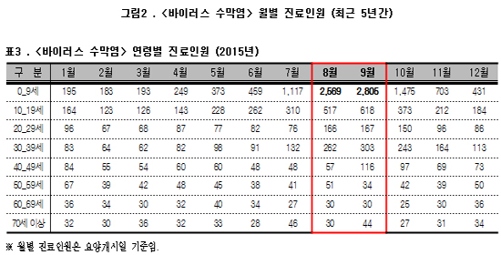 2011~2014년 중 진료인원이 가장 많았던 달은 7월이었지만, 2015년에는 9월에 진료인원이 더 많았다. 이중 83%가 20세 미만 청소년인 것으로 나타났다. 또 진료인원이 많은 10세 미만 진료인원이 여름철에 크게 증가하면서 전체 진료인원(월별) 중 차지하는 비중이 약 70%까지 높아졌다.