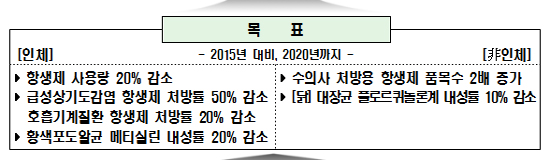 2015년 대비 2020년 목표는 항생제 사용량 20% 감소, 급성상기도감염 항생제 처방률 50% 감소, 호흡기계질환 항생제 처방률 20% 감소, 황색포도알균 메티실린 내성률 20% 감소, 수의사 처방용 항생제 품목수 2배 증가, 닭 대장균 플로르퀴놀론계 내성률 10% 감소 등으로 정했다.
