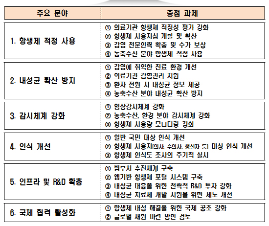 이를 위해 항생제 적정사용, 내성균 확산방지, 감시체계 강화, 인식개선, 인프라 및 R&D 확충, 국제협력 활성화 등 6가지를 중점과제로 추진하기로 했다.