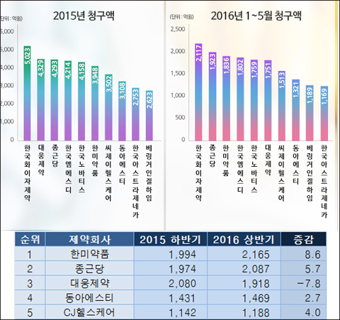 특히 종근당은 5월 누적 청구액으로 1위를 차지한 가운데 상반기 누적 원외처방액 부문에서도 한미약품과 경합을 전개하고 있어 국내 처방약 시장 선두권도 가능할 것이라는 전망이다.