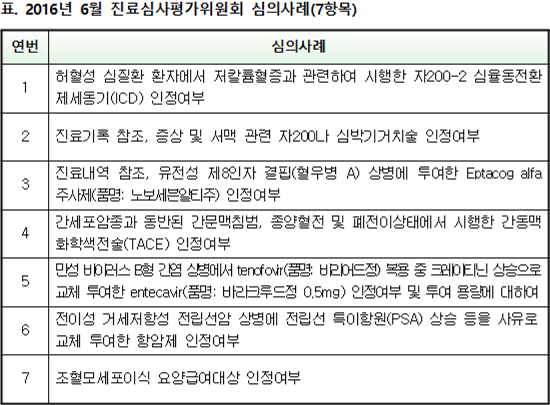 허혈성 심질환자 저칼륨혈증 치료 시 심율동전환제세동기(ICD) 인정 여부와 테노포비르(제품명 비리어드)를 복용중인 만성 B형간염 환자에게 크레아티닌 상승을 이유로 교체 투약한 엔테카비르(제품명 바라크루드) 인정 여부 등이 포함됐다.