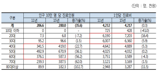1인당 입원일수는 2011년 30.9일에서 2015년 34.6일로 3.7일(약 4일)이 증가했다. 반면, 외래 내원일수는 2011년 12.3일에서 2015년 11.6일로 0.7일(약 1일) 감소한 것으로 나타났다.