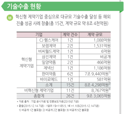 글로벌 진출도 혁신형 제약기업이 주도하고 있는 것으로 나타났다. 의약품 수출액은 2012년 8256억원, 2013년 9593억원, 2014년 1조1604억원으로 늘었다. 3년간 40.6% 증가한 셈이다. 또 2015년 기준 총 15건, 8조 4000억원 규모의 해외기술 수출계약을 체결했다.