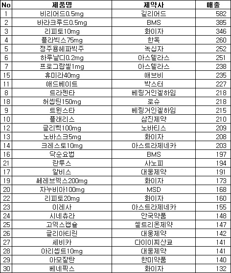 이밖에 항암제가 3품목, 항혈전제와 정신과계열 약물이 2품목씩 진입해 점유율을 지켰다.